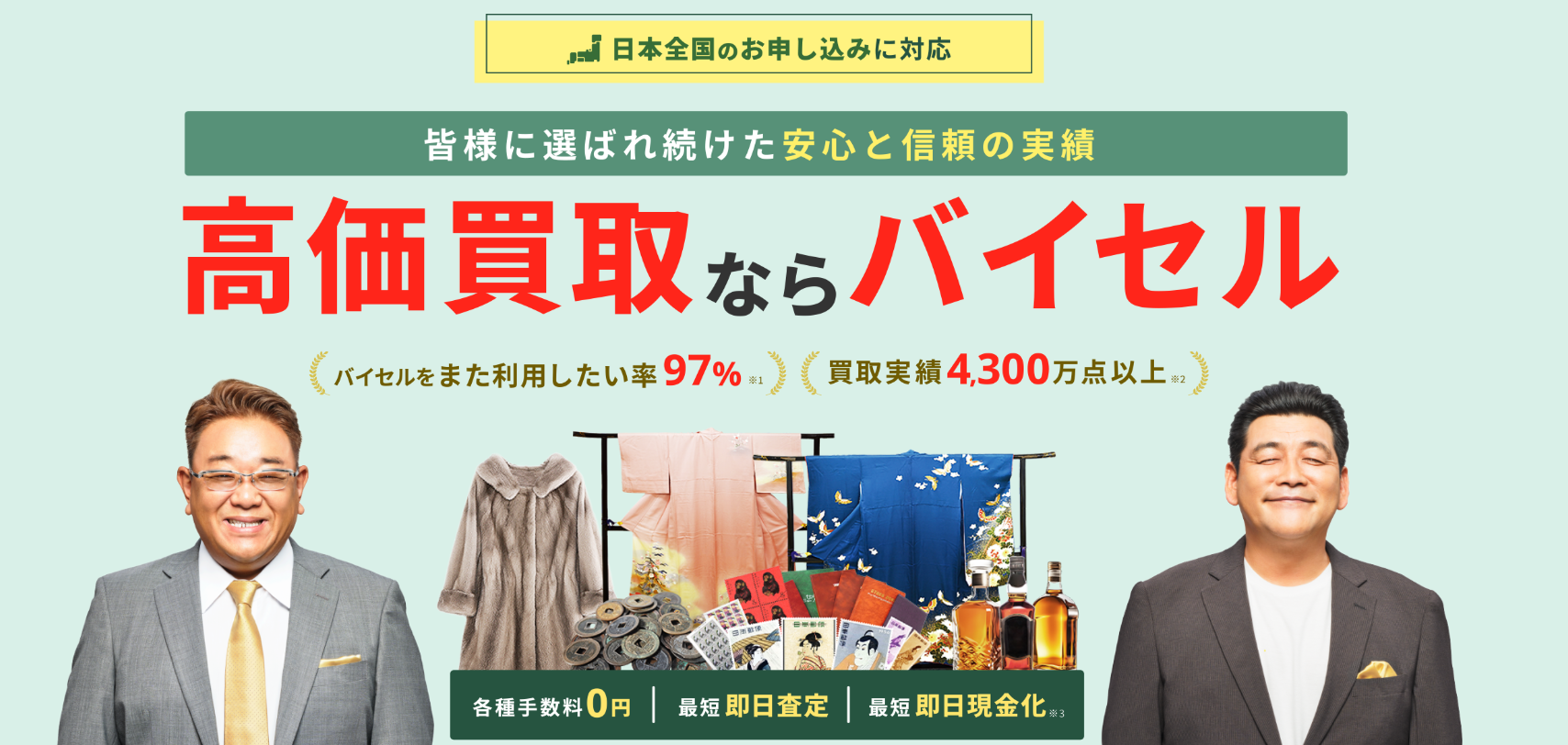 バイセルは、着物・切手・古銭・ブランド品・時計・貴金属・カメラ・レコード・お酒・食器・楽器・ゴルフクラブなど、暮らしの中に眠っている幅広いお品物をまとめて査定・買取してくれる総合リユースサービスです。出張・宅配・店頭の3つの方法から選べるため、量が多い方も一点だけ相談したい方も使いやすいのが特長です。
